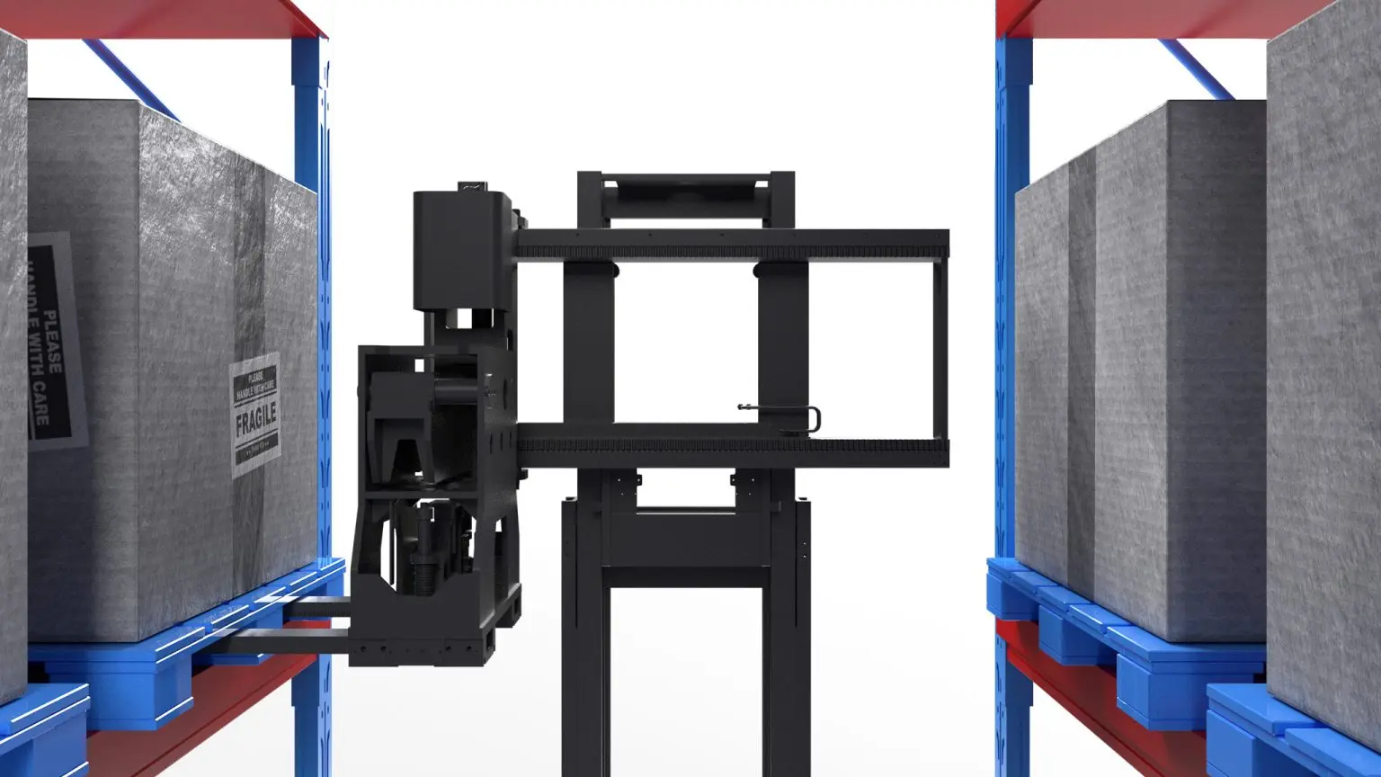 Het zijwaartse vorkontwerp maakt het mogelijk pallets op te nemen en te plaatsen zonder te draaien. Dat verkort de cyclustijd en verhoogt de throughput in smalle gangen.
